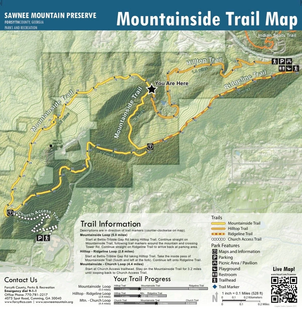 Now that the winter cold is making its way out and the weather is warming up, I want to highlight an amazing outdoor spot located in Cumming, GA off of Bettis-Tribble Gap Road. Sawnee Mountain Preserve is an expansive 963-acre public park that is home to the Sawnee Mountain trails. That’s about 3 times the size of Atlanta’s Piedmont Park! Sawnee Mountain features two distinct trail systems that cover a little over 11 miles, Indian Seats Trail and Mountainside Trail. These trails can be taken alone or combined to create unique hiking experiences during each visit to the preserve. The Visitor Center, located on 4075 Spot Road, has information about the mountain such as the plants and animals on the mountain, Native American artifacts, and the history of the preserve.