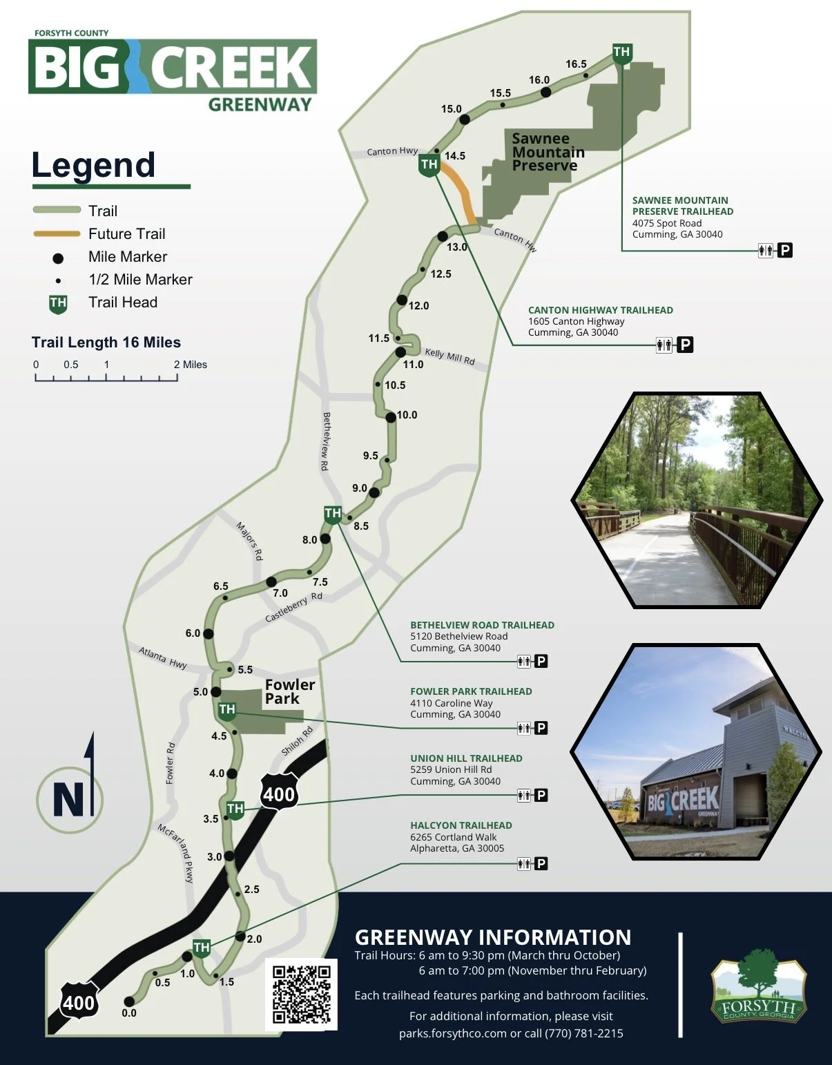 Please note that while the Greenway covers about 25 miles, sections may be disconnected between counties and in various sections for renovations. Currently, the trail from the Bethelview Trailhead through mile marker 10.3 south of Kelly Mill is closed for renovation and cannot be accessed. Be sure to check out the Forsyth County Parks and Recreation Big Creek Greenway website for status updates.
